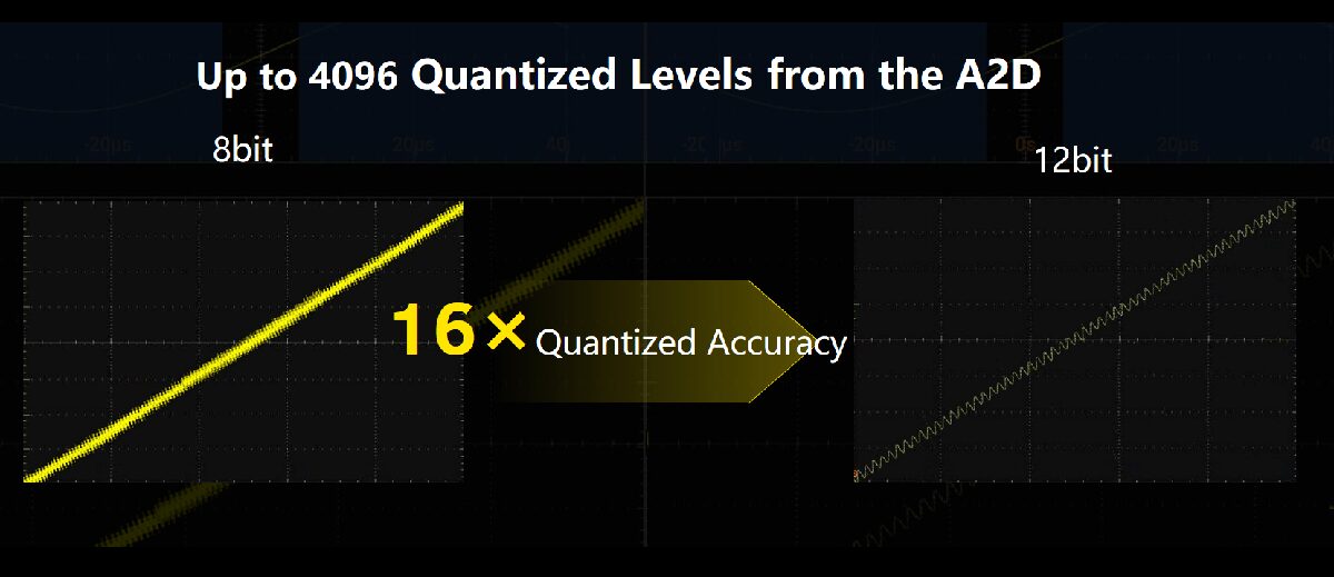 Серия MHO2000 обладает превосходным 12-битным разрешением и обеспечивает до 4096 уровней квантования, что значительно повышает точность измерений. По сравнению с 8-битными осциллографами она отображает до 16 раз больше деталей, фиксируя малейшие изменения сигнала. Благодаря вертикальной чувствительности до 200 мкВ/дел, она идеально подходит для таких задач, как измерение пульсаций источников питания или анализ медицинских сигналов, гарантируя точность анализа, необходимую для инноваций и надежности.