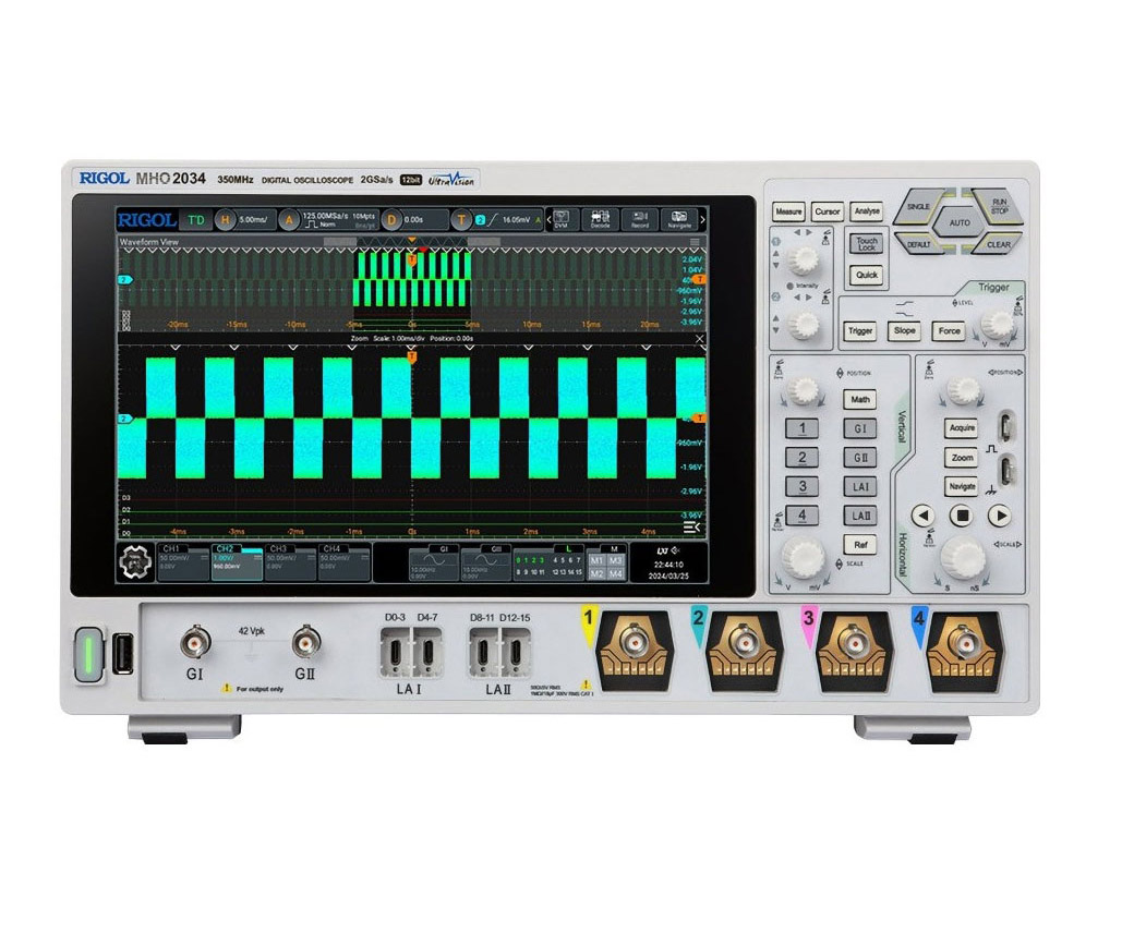 Цифровой осциллограф RIGOL MHO2034 – 4-х канальный осциллограф высокого разрешения (12 бит) с полосой пропускания 350 МГц, выполненный в компактном корпусе, с возможностью работы от автономного источника питания. MHO2034 построен на технологической платформе «Centaurus», собственной разработки компании RIGOL.